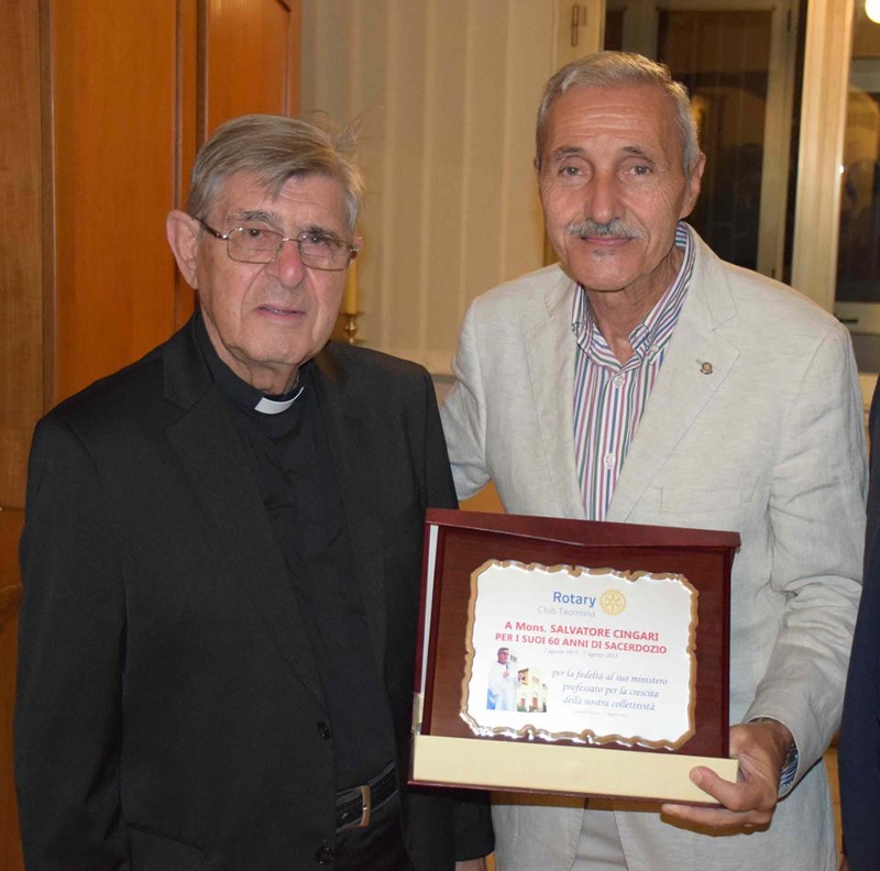 Continuando la tradizione di "attenzione" al proprio territorio, il Club si è recato a Giardini-Naxos nella Parrocchia di San Pancrazio a rendere doveroso omaggio a Monsignor Salvatore Cingari, taorminese, che in questi giorni ha festeggiato il 60° di ordinazione sacerdotale. Un traguardo importantissimo festeggiato da tutta la comunità locale.